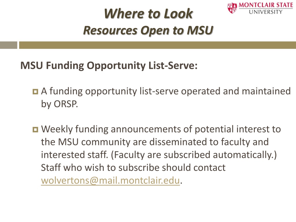 Where to LookResources Open to MSU MSU Funding Opportunity List-Serve: • A funding opportunity list-serve operated and maintained by ORSP. • Weekly funding announcements of potential interest to the MSU community are disseminated to faculty and interested staff. (Faculty are subscribed automatically.) Staff who wish to subscribe should contact wolvertons@mail.montclair.edu.