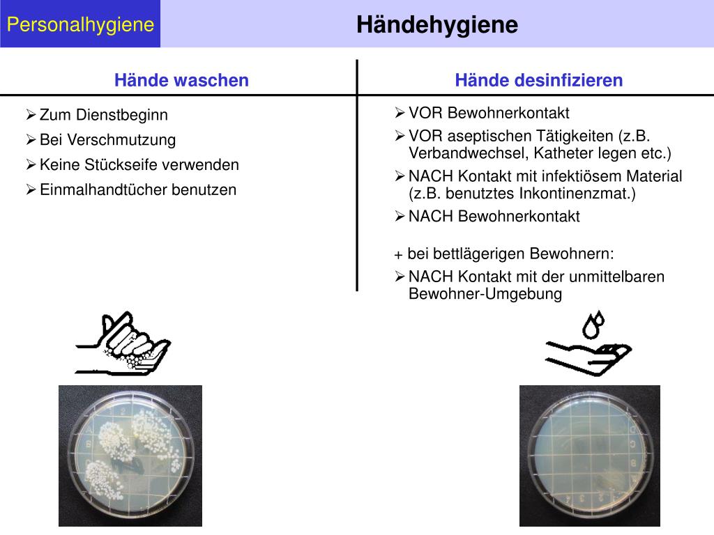 Personalhygiene Händehygiene Hände waschen Hände desinfizieren • Zum Dienstbeginn • Bei Verschmutzung • Keine Stückseife verwenden • Einmalhandtücher benutzen • VOR Bewohnerkontakt • VOR aseptischen Tätigkeiten (z.B. Verbandwechsel, Katheter legen etc.) • NACH Kontakt mit infektiösem Material (z.B. benutztes Inkontinenzmat.) • NACH Bewohnerkontakt • + bei bettlägerigen Bewohnern: • NACH Kontakt mit der unmittelbaren Bewohner-Umgebung