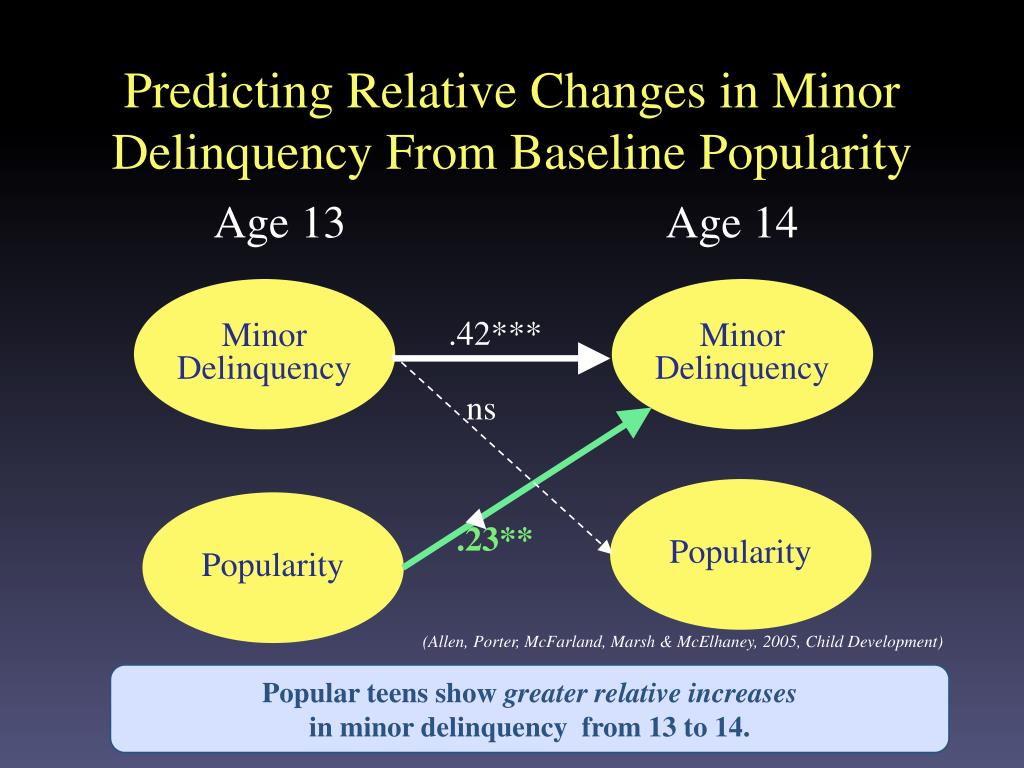 Predicting Relative Changes in Minor Delinquency From Baseline Popularity Age 13 Age 14 Minor Delinquency Minor Delinquency .42*** ns Popularity Popularity .23** (Allen, Porter, McFarland, Marsh & McElhaney, 2005, Child Development) Popular teens show greater relativeincreases in minor delinquency from 13 to 14.
