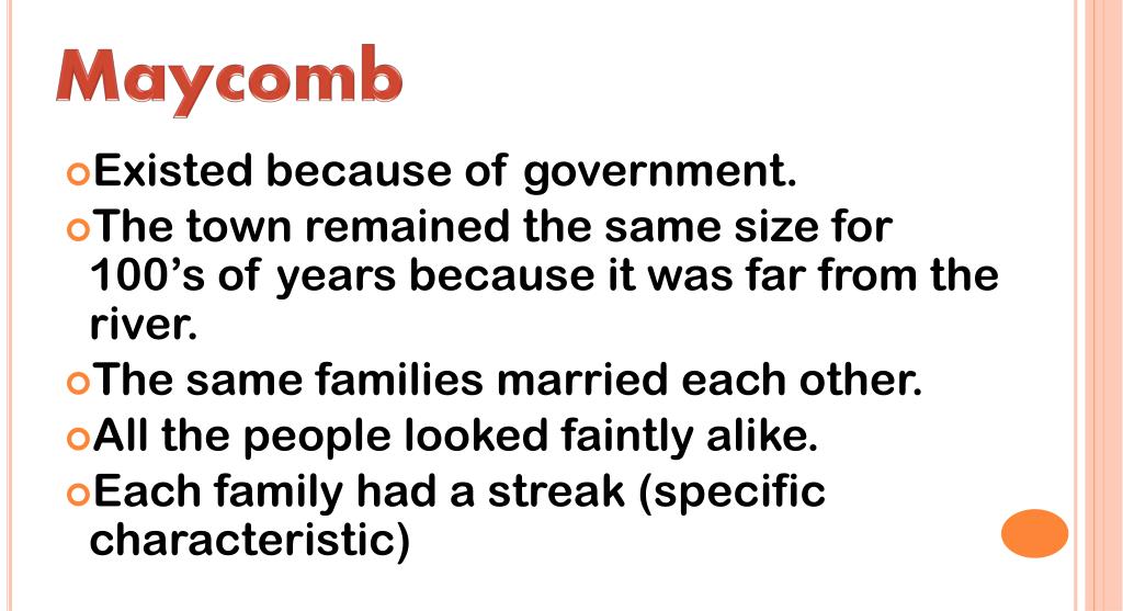Maycomb • Existed because of government. • The town remained the same size for 100’s of years because it was far from the river. • The same families married each other. • All the people looked faintly alike. • Each family had a streak (specific characteristic)