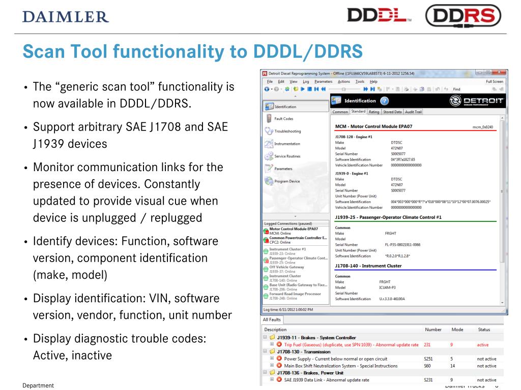 Scan Tool functionality to DDDL/DDRS • The “generic scan tool” functionality is now available in DDDL/DDRS. • Support arbitrary SAE J1708 and SAE J1939 devices • Monitor communication links for the presence of devices. Constantly updated to provide visual cue when device is unplugged / replugged • Identify devices: Function, software version, component identification (make, model) • Display identification: VIN, software version, vendor, function, unit number • Display diagnostic trouble codes: Active, inactive Department