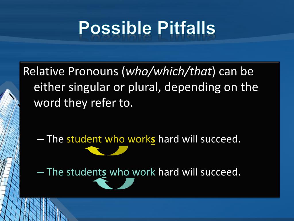 Possible Pitfalls Relative Pronouns (who/which/that) can be either singular or plural, depending on the word they refer to. • The student who works hard will succeed. • The students who work hard will succeed.