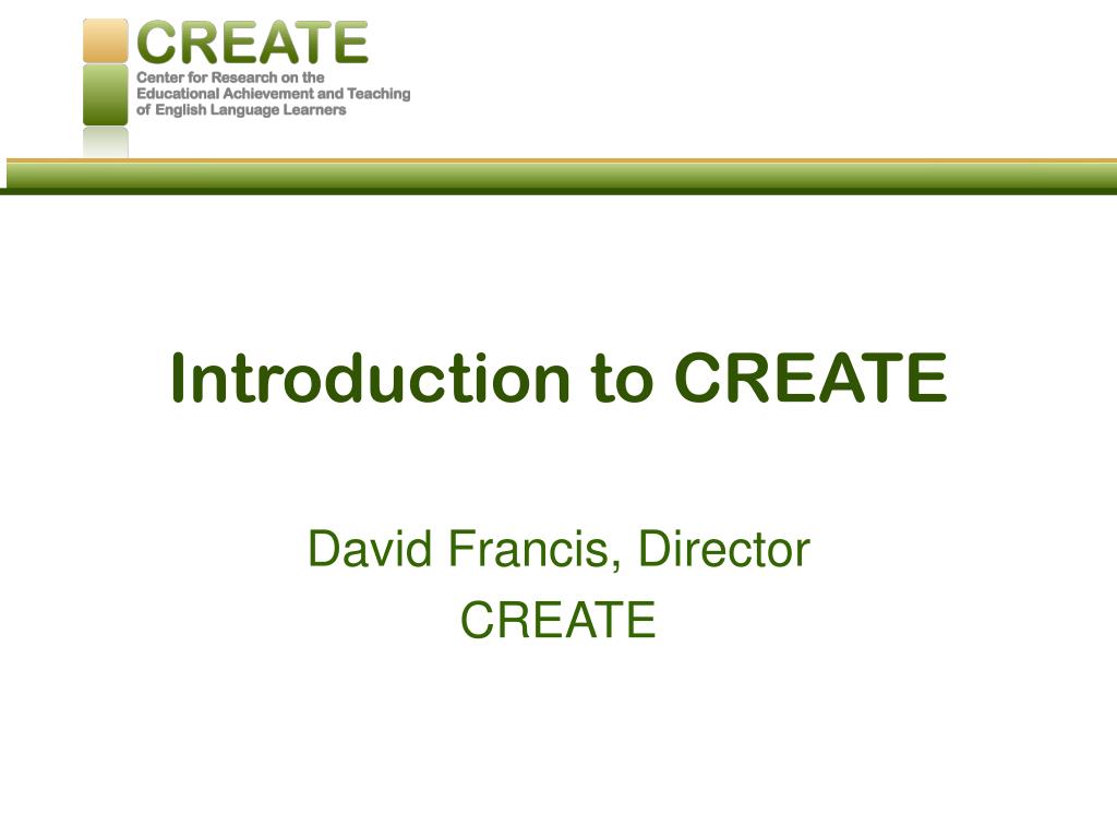 About CREATE CREATE is a partnership of researchers from several institutions: CREATE is a partnership of researchers from several institutions: Texas Inst. for Measurement, Evaluation, and Statistics, Univ. of HoustonDavid J. Francis, Coleen D. Carlson California State University at Long BeachJana Echevarria, Catherine Richards Center for Applied LinguisticsDiane August, Deborah Short Harvard UniversityCatherine Snow University of California-BerkeleyElfrieda Hiebert The Meadows Center for Preventing Educational Risk, UT - AustinSharon Vaughn, Sylvia Linan-Thompson 12