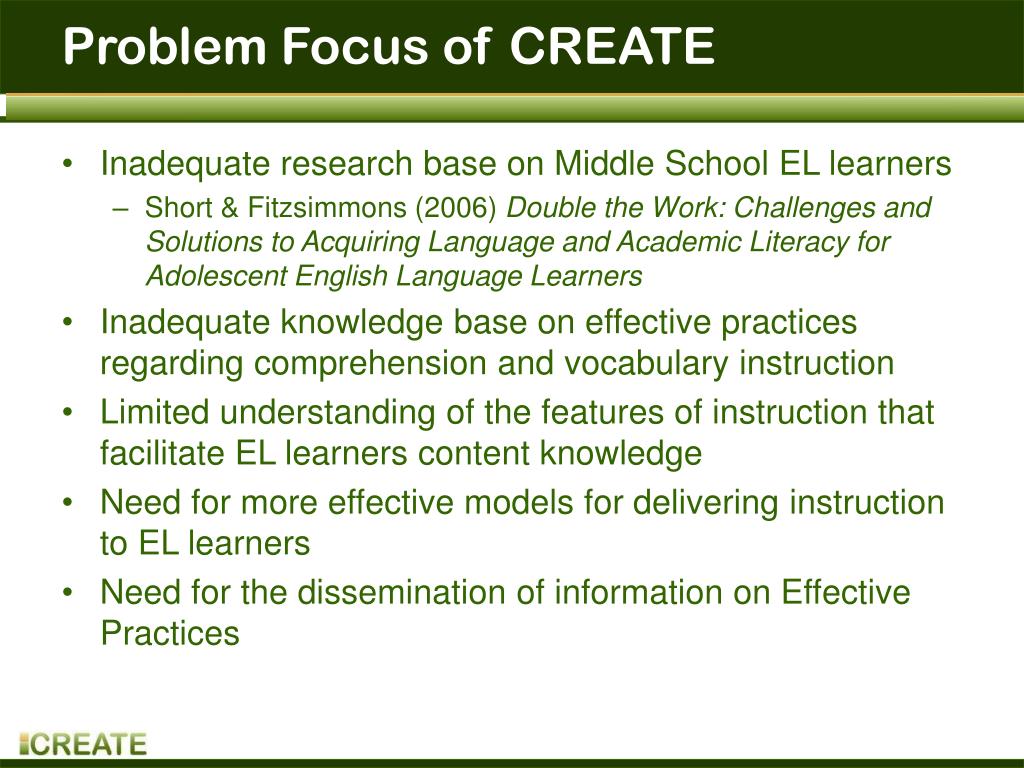 Problem Focus of CREATE Inadequate research base on Middle School EL learners Short & Fitzsimmons (2006) Double the Work: Challenges and Solutions to Acquiring Language and Academic Literacy for Adolescent English Language Learners Inadequate knowledge base on effective practices regarding comprehension and vocabulary instruction Limited understanding of the features of instruction that facilitate EL learners content knowledge Need for more effective models for delivering instruction to EL learners Need for the dissemination of information on Effective Practices