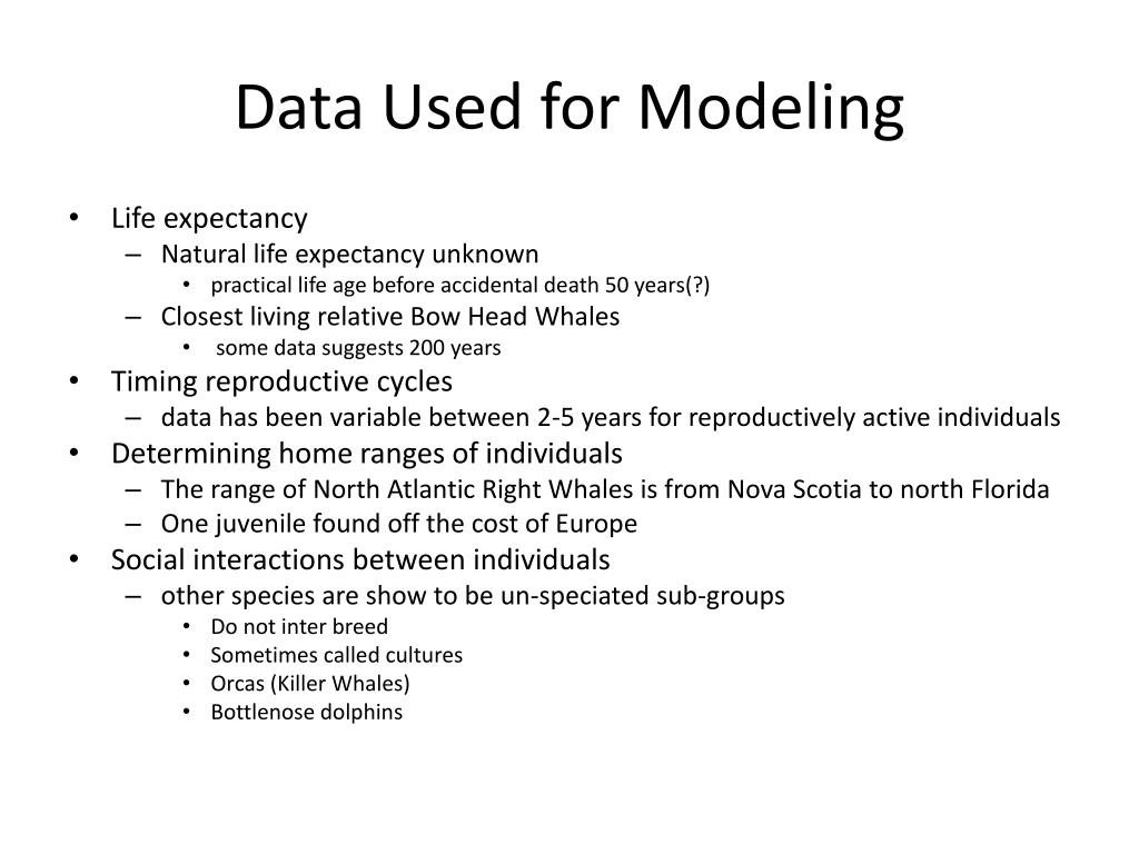 Data Used for Modeling • Life expectancy • Natural life expectancy unknown • practical life age before accidental death 50 years(?) • Closest living relative Bow Head Whales • some data suggests 200 years • Timing reproductive cycles • data has been variable between 2-5 years for reproductively active individuals • Determining home ranges of individuals • The range of North Atlantic Right Whales is from Nova Scotia to north Florida • One juvenile found off the cost of Europe • Social interactions between individuals • other species are show to be un-speciated sub-groups • Do not inter breed • Sometimes called cultures • Orcas (Killer Whales) • Bottlenose dolphins