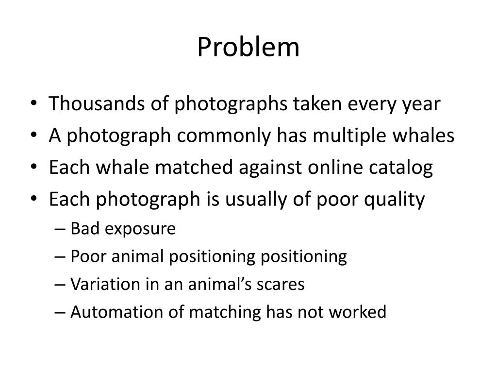 Problem • Thousands of photographs taken every year • A photograph commonly has multiple whales • Each whale matched against online catalog • Each photograph is usually of poor quality • Bad exposure • Poor animal positioning positioning • Variation in an animal’s scares • Automation of matching has not worked
