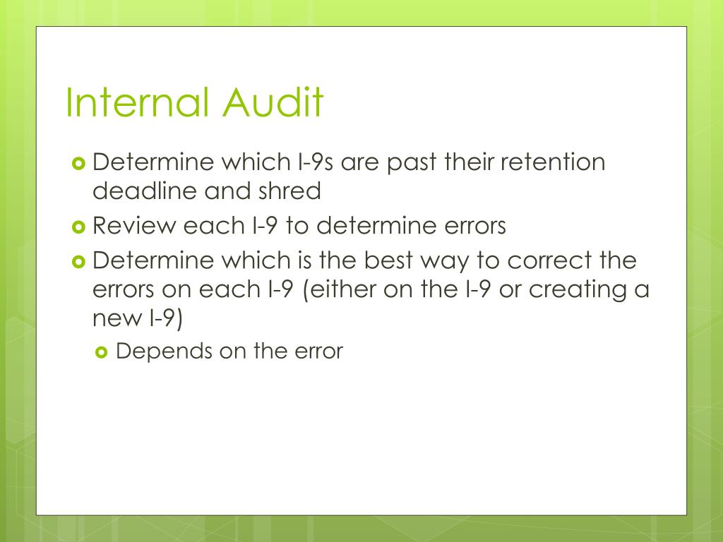 Internal Audit • Determine which I-9s are past their retention deadline and shred • Review each I-9 to determine errors • Determine which is the best way to correct the errors on each I-9 (either on the I-9 or creating a new I-9) • Depends on the error