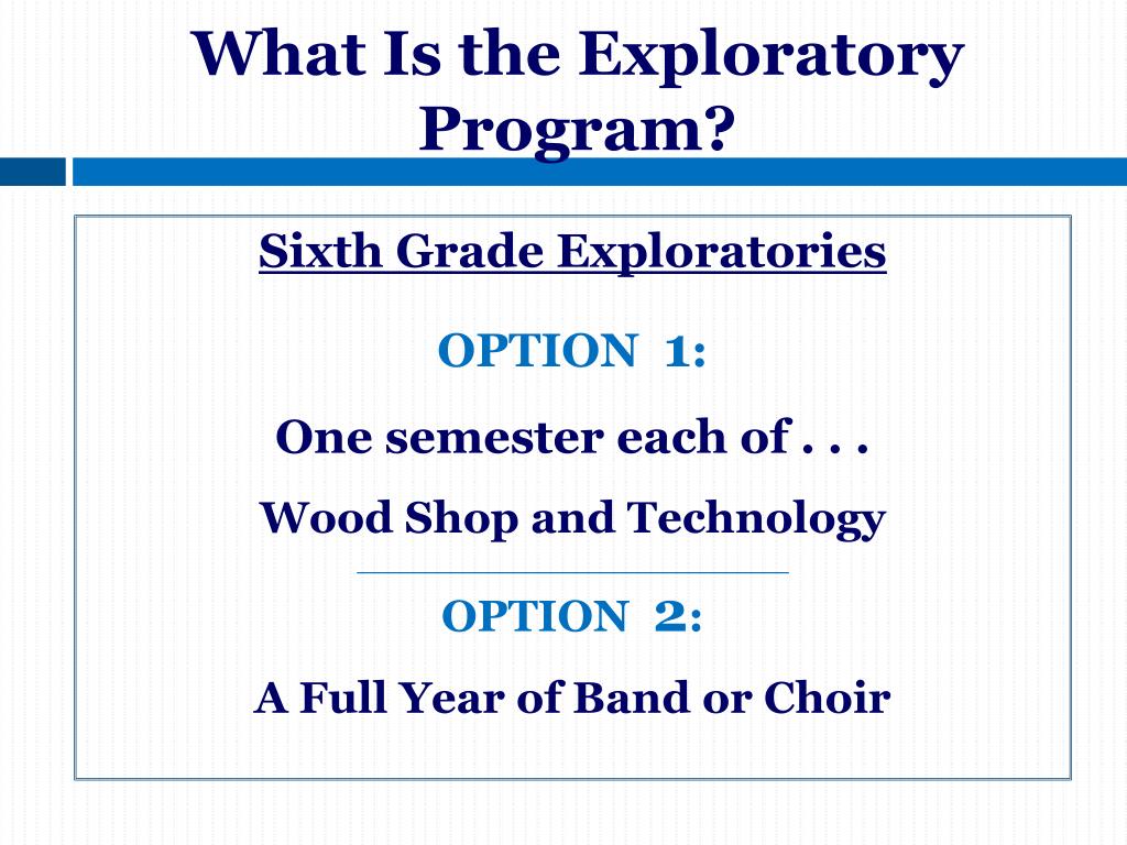 What Is the Exploratory Program? Sixth Grade Exploratories OPTION 1: One semester each of . . . Wood Shop and Technology OPTION 2: A Full Year of Band or Choir