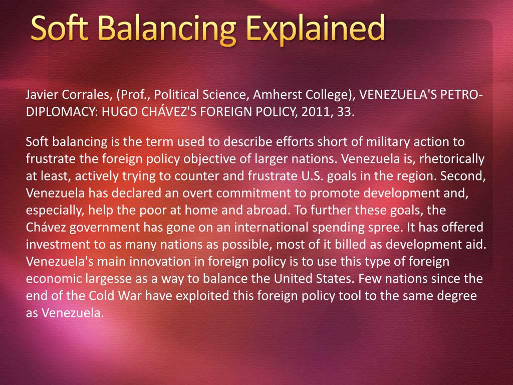 Soft Balancing Explained Javier Corrales, (Prof., Political Science, Amherst College), VENEZUELA'S PETRO-DIPLOMACY: HUGO CHÁVEZ'S FOREIGN POLICY, 2011, 33. Soft balancing is the term used to describe efforts short of military action to frustrate the foreign policy objective of larger nations. Venezuela is, rhetorically at least, actively trying to counter and frustrate U.S. goals in the region. Second, Venezuela has declared an overt commitment to promote development and, especially, help the poor at home and abroad. To further these goals, the Chávez government has gone on an international spending spree. It has offered investment to as many nations as possible, most of it billed as development aid. Venezuela's main innovation in foreign policy is to use this type of foreign economic largesse as a way to balance the United States. Few nations since the end of the Cold War have exploited this foreign policy tool to the same degree as Venezuela.