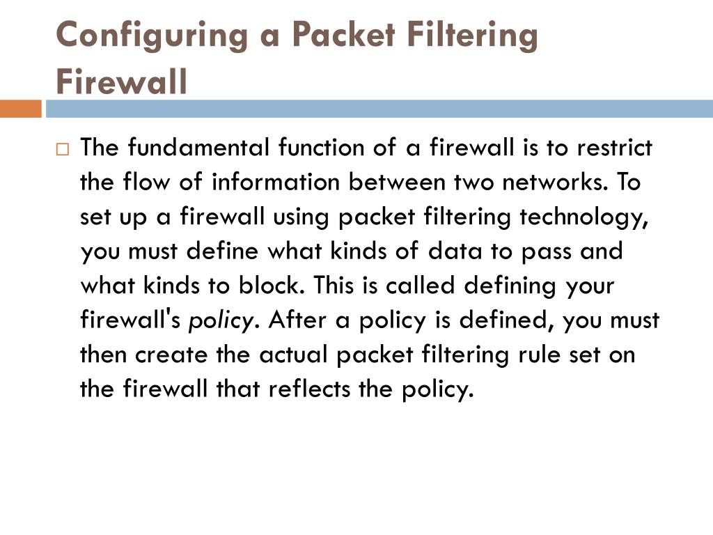 Configuring a Packet Filtering Firewall • The fundamental function of a firewall is to restrict the flow of information between two networks. To set up a firewall using packet filtering technology, you must define what kinds of data to pass and what kinds to block. This is called defining your firewall's policy. After a policy is defined, you must then create the actual packet filtering rule set on the firewall that reflects the policy.