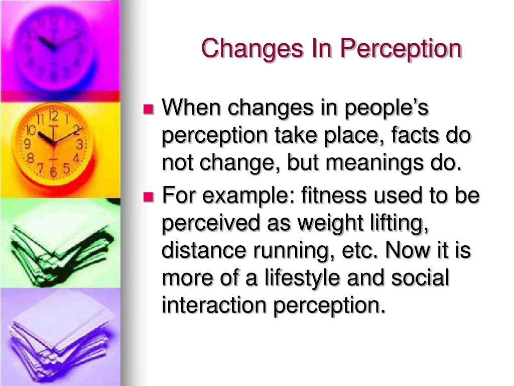 Changes In Perception • When changes in people’s perception take place, facts do not change, but meanings do. • For example: fitness used to be perceived as weight lifting, distance running, etc. Now it is more of a lifestyle and social interaction perception.