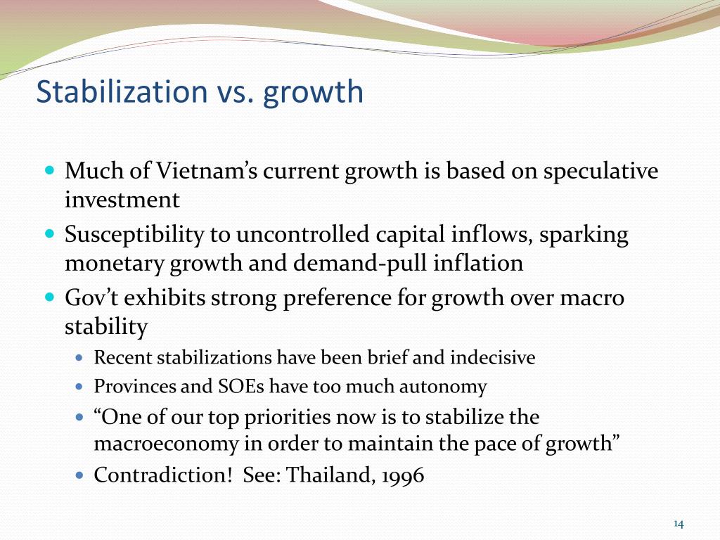 Stabilization vs. growth • Much of Vietnam’s current growth is based on speculative investment • Susceptibility to uncontrolled capital inflows, sparking monetary growth and demand-pull inflation • Gov’t exhibits strong preference for growth over macro stability • Recent stabilizations have been brief and indecisive • Provinces and SOEs have too much autonomy • “One of our top priorities now is to stabilize the macroeconomy in order to maintain the pace of growth” • Contradiction! See: Thailand, 1996