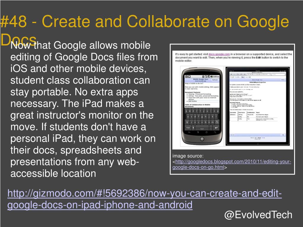 #48 - Create and Collaborate on Google Docs Now that Google allows mobile editing of Google Docs files from iOS and other mobile devices, student class collaboration can stay portable. No extra apps necessary. The iPad makes a great instructor's monitor on the move. If students don't have a personal iPad, they can work on their docs, spreadsheets and presentations from any web-accessible location image source: <http://googledocs.blogspot.com/2010/11/editing-your-google-docs-on-go.html> http://gizmodo.com/#!5692386/now-you-can-create-and-edit-google-docs-on-ipad-iphone-and-android @EvolvedTech