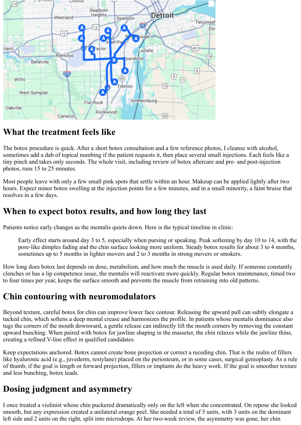 This map was created by a user Learn how to create your own What the treatment feels like The botox procedure is quick. After a short botox consultation and a few reference photos, I cleanse with alcohol, sometimes add a dab of topical numbing if the patient requests it, then place several small injections. Each feels like a tiny pinch and takes only seconds. The whole visit, including review of botox aftercare and pre- and post-injection photos, runs 15 to 25 minutes. Most people leave with only a few small pink spots that settle within an hour. Makeup can be applied lightly after two hours. Expect minor botox swelling at the injection points for a few minutes, and in a small minority, a faint bruise that resolves in a few days. When to expect botox results, and how long they last Patients notice early changes as the mentalis quiets down. Here is the typical timeline in clinic: Early effect starts around day 3 to 5, especially when pursing or speaking. Peak softening by day 10 to 14, with the pore-like dimples fading and the chin surface looking more uniform. Steady botox results for about 3 to 4 months, sometimes up to 5 months in lighter movers and 2 to 3 months in strong movers or smokers. How long does botox last depends on dose, metabolism, and how much the muscle is used daily. If someone constantly clenches or has a lip competence issue, the mentalis will reactivate more quickly. Regular botox maintenance, timed two to four times per year, keeps the surface smooth and prevents the muscle from retraining into old patterns. Chin contouring with neuromodulators Beyond texture, careful botox for chin can improve lower face contour. Releasing the upward pull can subtly elongate a tucked chin, which softens a deep mental crease and harmonizes the profile. In patients whose mentalis dominance also tugs the corners of the mouth downward, a gentle release can indirectly lift the mouth corners by removing the constant upward bunching. When paired with botox for jawline shaping in the masseter, the chin relaxes while the jawline thins, creating a refined V-line effect in qualified candidates. Keep expectations anchored. Botox cannot create bone projection or correct a receding chin. That is the realm of fillers like hyaluronic acid (e.g., juvederm, restylane) placed on the periosteum, or in some cases, surgical genioplasty. As a rule of thumb, if the goal is length or forward projection, fillers or implants do the heavy work. If the goal is smoother texture and less bunching, botox leads. Dosing judgment and asymmetry I once treated a violinist whose chin puckered dramatically only on the left when she concentrated. On repose she looked smooth, but any expression created a unilateral orange peel. She needed a total of 5 units, with 3 units on the dominant left side and 2 units on the right, split into microdrops. At her two-week review, the asymmetry was gone, her chin