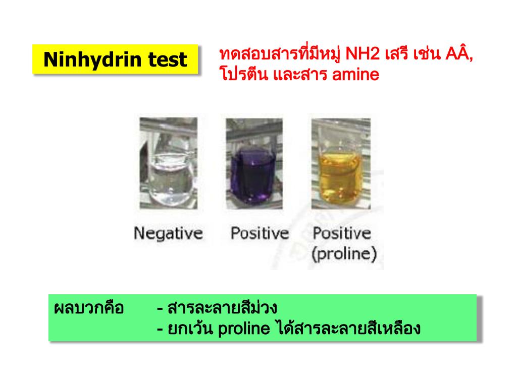 ทดสอบสารที่มีหมู่ NH2 เสรี เช่น AÂ, โปรตีน และสาร amine Ninhydrin test ผลบวกคือ - สารละลายสีม่วง - ยกเว้น prolineได้สารละลายสีเหลือง