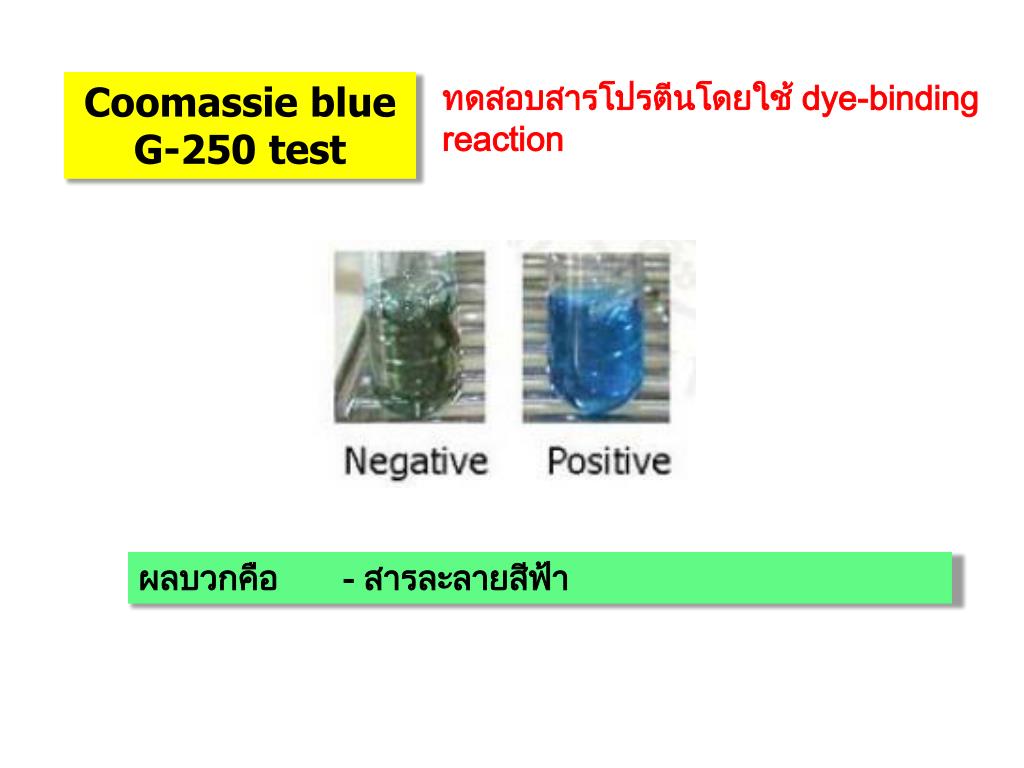 Coomassie blue G-250 test ทดสอบสารโปรตีนโดยใช้ dye-binding reaction ผลบวกคือ - สารละลายสีฟ้า