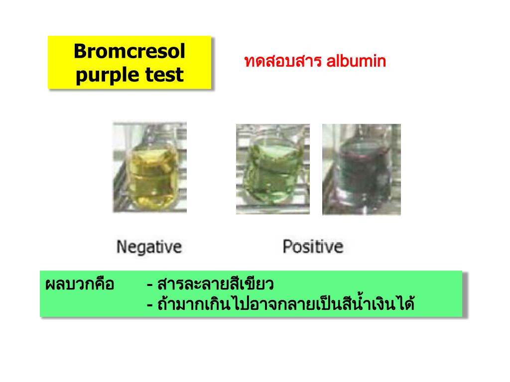 Bromcresol purple test ทดสอบสาร albumin ผลบวกคือ - สารละลายสีเขียว -ถ้ามากเกินไปอาจกลายเป็นสีน้ำเงินได้
