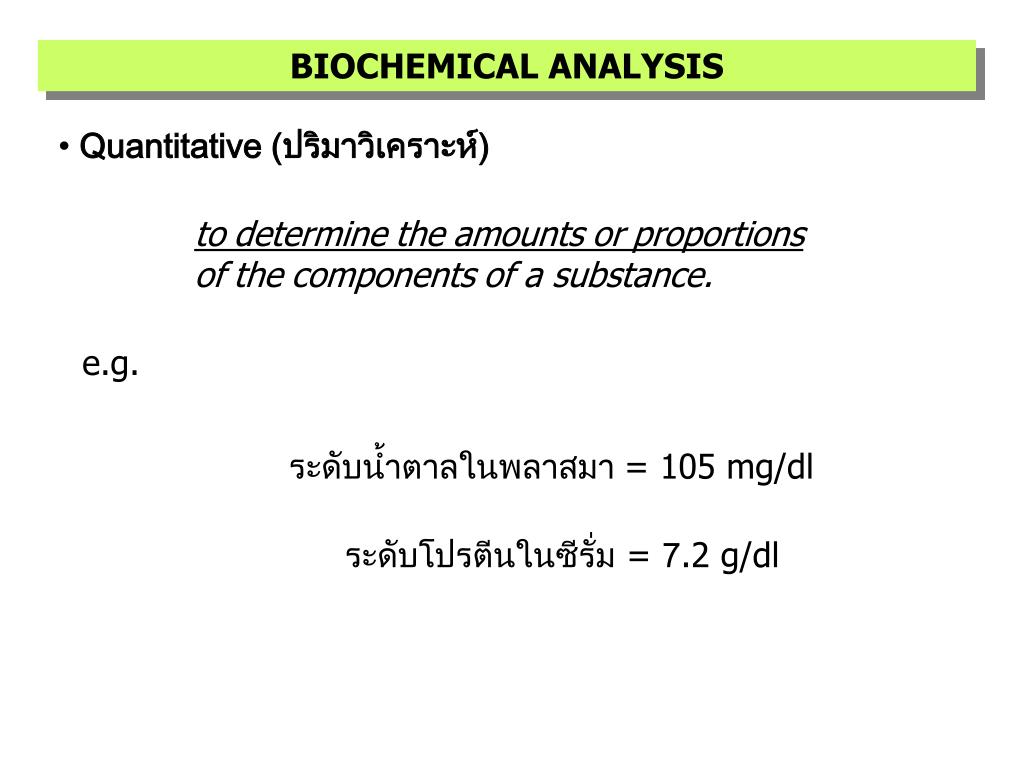 BIOCHEMICAL ANALYSIS • Quantitative (ปริมาวิเคราะห์) todeterminetheamountsorproportionsofthecomponentsof a substance. e.g. ระดับน้ำตาลในพลาสมา = 105 mg/dl ระดับโปรตีนในซีรั่ม = 7.2 g/dl