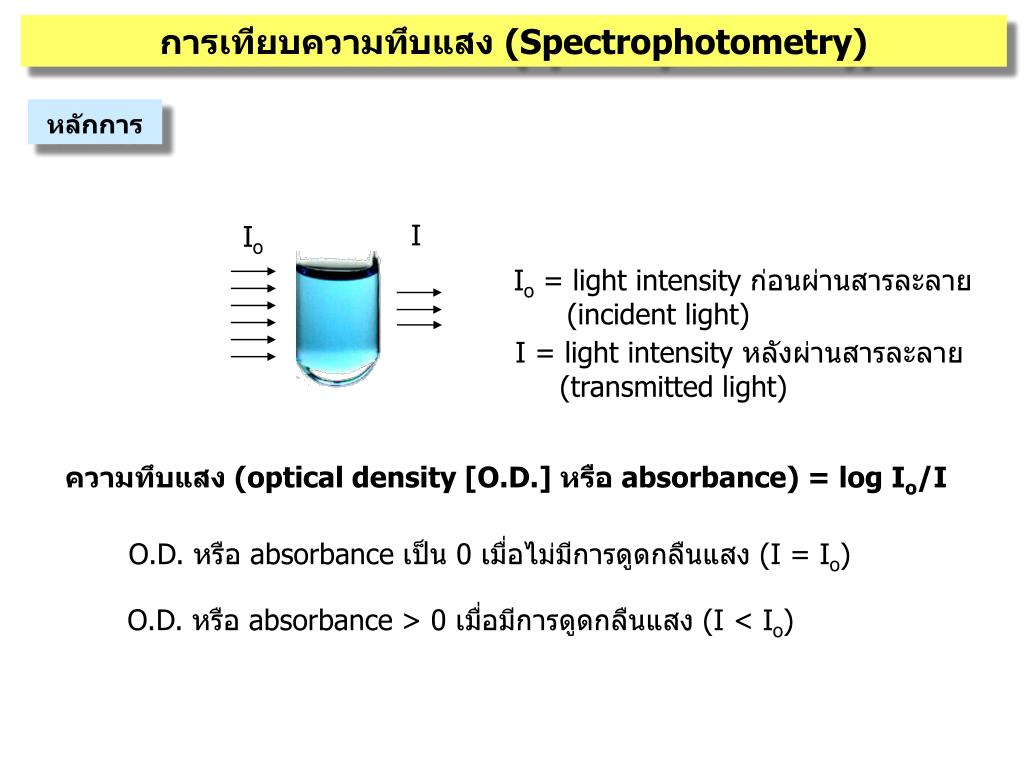 การเทียบความทึบแสง (Spectrophotometry) หลักการ I Io Io = light intensity ก่อนผ่านสารละลาย (incident light) I = light intensity หลังผ่านสารละลาย (transmitted light) ความทึบแสง (optical density [O.D.] หรือ absorbance) = log Io/I O.D. หรือ absorbance เป็น 0 เมื่อไม่มีการดูดกลืนแสง (I = Io) O.D. หรือ absorbance > 0 เมื่อมีการดูดกลืนแสง (I < Io)