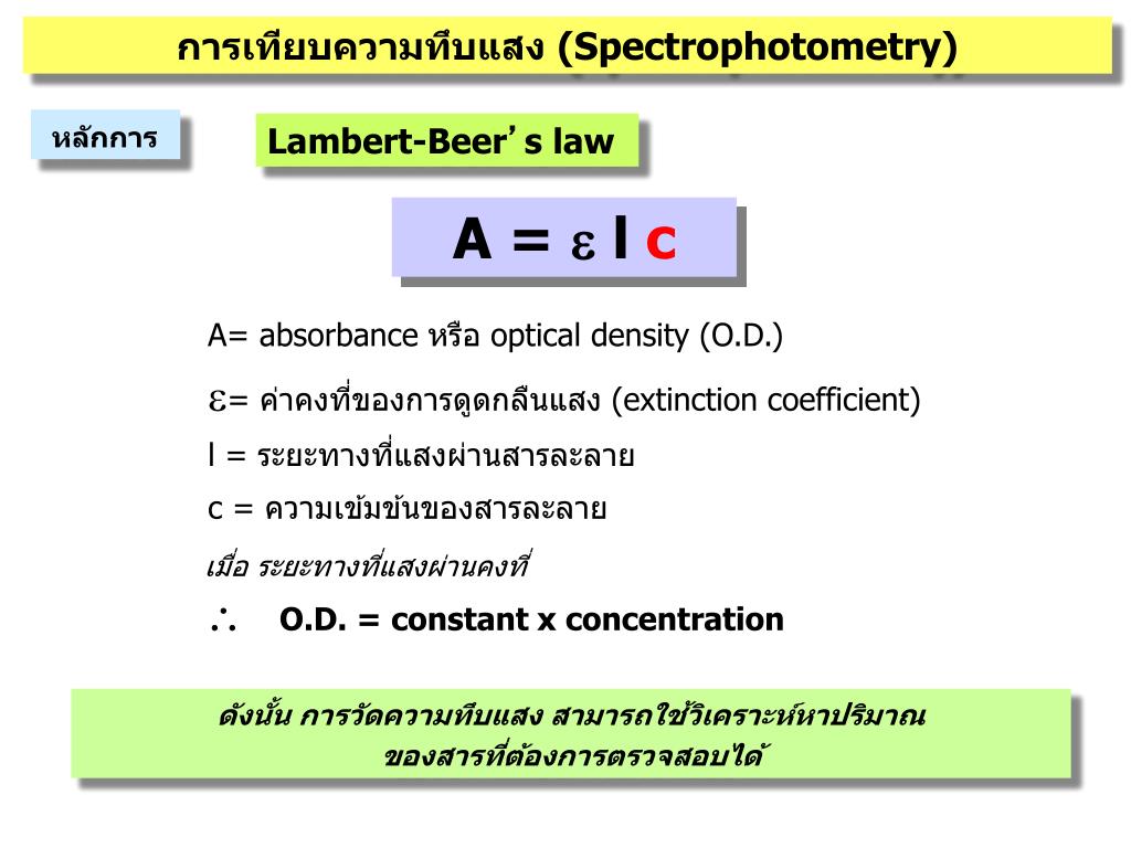 การเทียบความทึบแสง (Spectrophotometry) หลักการ Lambert-Beer’s law A = e l c A= absorbance หรือ optical density (O.D.) = ค่าคงที่ของการดูดกลืนแสง (extinction coefficient) l= ระยะทางที่แสงผ่านสารละลาย c= ความเข้มข้นของสารละลาย เมื่อ ระยะทางที่แสงผ่านคงที่ \ O.D. = constant x concentration ดังนั้น การวัดความทึบแสง สามารถใช้วิเคราะห์หาปริมาณ ของสารที่ต้องการตรวจสอบได้
