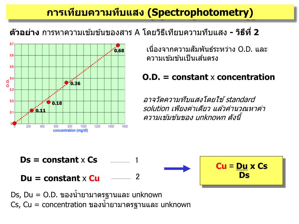1 Ds = constant x Cs 2 Du = constant xCu Cu = Du x Cs Ds Ds, Du = O.D. ของน้ำยามาตรฐานและ unknown Cs, Cu = concentration ของน้ำยามาตรฐานและ unknown การเทียบความทึบแสง (Spectrophotometry) ตัวอย่าง การหาความเข้มข้นของสาร A โดยวิธีเทียบความทึบแสง - วิธีที่ 2 เนื่องจากความสัมพันธ์ระหว่าง O.D. และ ความเข้มข้นเป็นเส้นตรง O.D. = constant x concentration อาจวัดความทึบแสงโดยใช้ standard solution เพียงค่าเดียว แล้วคำนวณหาค่าความเข้มข้นของ unknown ดังนี้