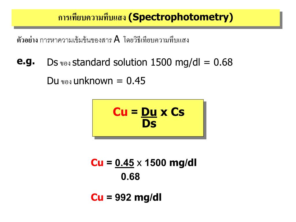 Cu = 0.45x 1500 mg/dl Cu = Du x Cs Ds 0.68 การเทียบความทึบแสง (Spectrophotometry) ตัวอย่าง การหาความเข้มข้นของสาร A โดยวิธีเทียบความทึบแสง e.g. Ds ของ standard solution 1500 mg/dl = 0.68 Du ของ unknown = 0.45 Cu = 992 mg/dl