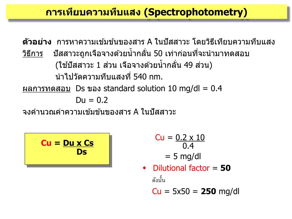 Cu = Du x Cs Ds การเทียบความทึบแสง (Spectrophotometry) ตัวอย่าง การหาความเข้มข้นของสาร A ในปัสสาวะ โดยวิธีเทียบความทึบแสง วิธีการ ปัสสาวะถูกเจือจางด้วยน้ำกลั่น 50 เท่าก่อนที่จะนำมาทดสอบ (ใช้ปัสสาวะ 1 ส่วน เจือจางด้วยน้ำกลั่น 49 ส่วน) นำไปวัดความทึบแสงที่ 540 nm. ผลการทดสอบDs ของ standard solution 10 mg/dl = 0.4 Du = 0.2 จงคำนวณค่าความเข้มข้นของสาร A ในปัสสาวะ • Cu = 0.2 x 10 • 0.4 • = 5 mg/dl • Dilutional factor = 50 • ดังนั้น • Cu = 5x50 = 250 mg/dl
