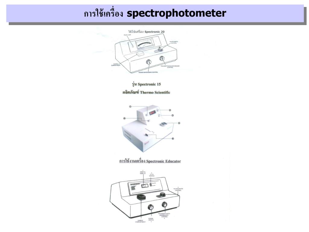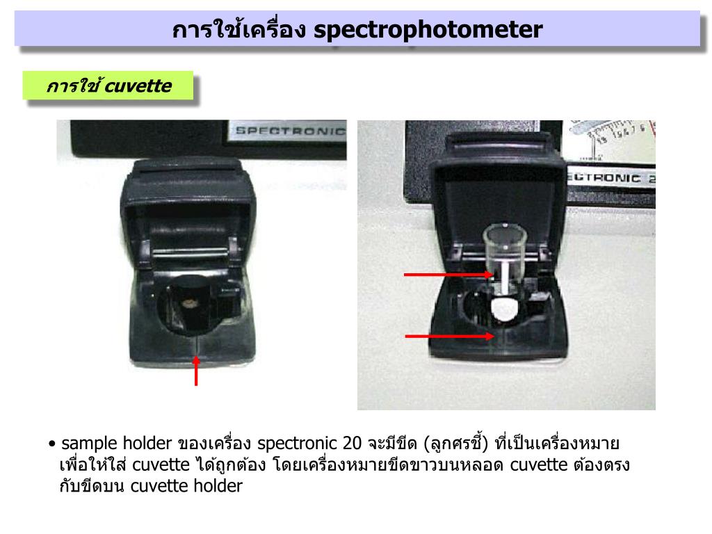 การใช้เครื่อง spectrophotometer การใช้ cuvette • sample holder ของเครื่อง spectronic 20 จะมีขีด (ลูกศรชี้)ที่เป็นเครื่องหมาย • เพื่อให้ใส่ cuvette ได้ถูกต้อง โดยเครื่องหมายขีดขาวบนหลอด cuvette ต้องตรง • กับขีดบน cuvette holder