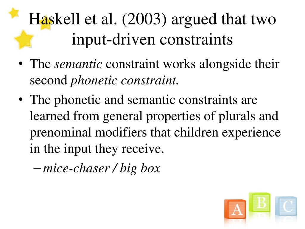 Haskell et al. (2003) argued that two input-driven constraints • The semantic constraint works alongside their second phonetic constraint. • The phonetic and semantic constraints are learned from general properties of plurals and prenominal modifiers that children experience in the input they receive. • mice-chaser / big box