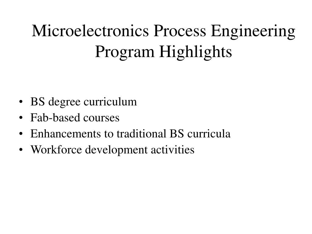 Microelectronics Process Engineering Program Highlights • BS degree curriculum • Fab-based courses • Enhancements to traditional BS curricula • Workforce development activities