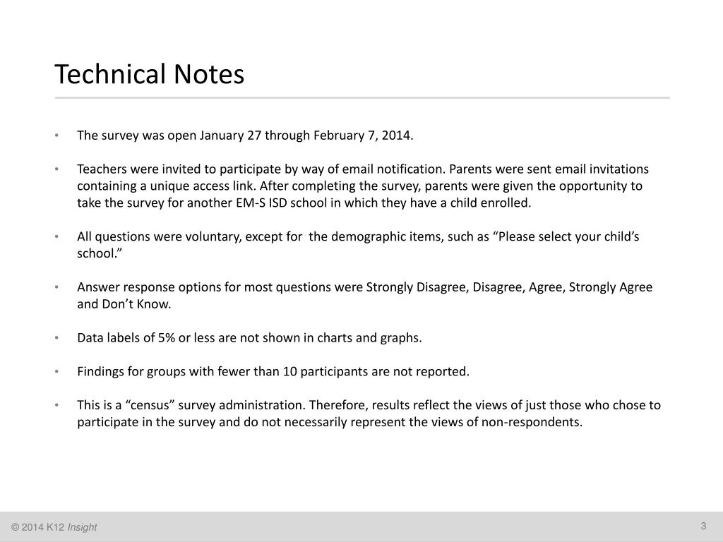 The survey was open January 27 through February 7, 2014. • Teachers were invited to participate by way of email notification. Parents were sent email invitations containing a unique access link. After completing the survey, parents were given the opportunity to take the survey for another EM-S ISD school in which they have a child enrolled. • All questions were voluntary, except for the demographic items, such as “Please select your child’s school.” • Answer response options for most questions were Strongly Disagree, Disagree, Agree, Strongly Agree and Don’t Know. • Data labels of 5% or less are not shown in charts and graphs. • Findings for groups with fewer than 10 participants are not reported. • This is a “census” survey administration. Therefore, results reflect the views of just those who chose to participate in the survey and do not necessarily represent the views of non-respondents. Technical Notes