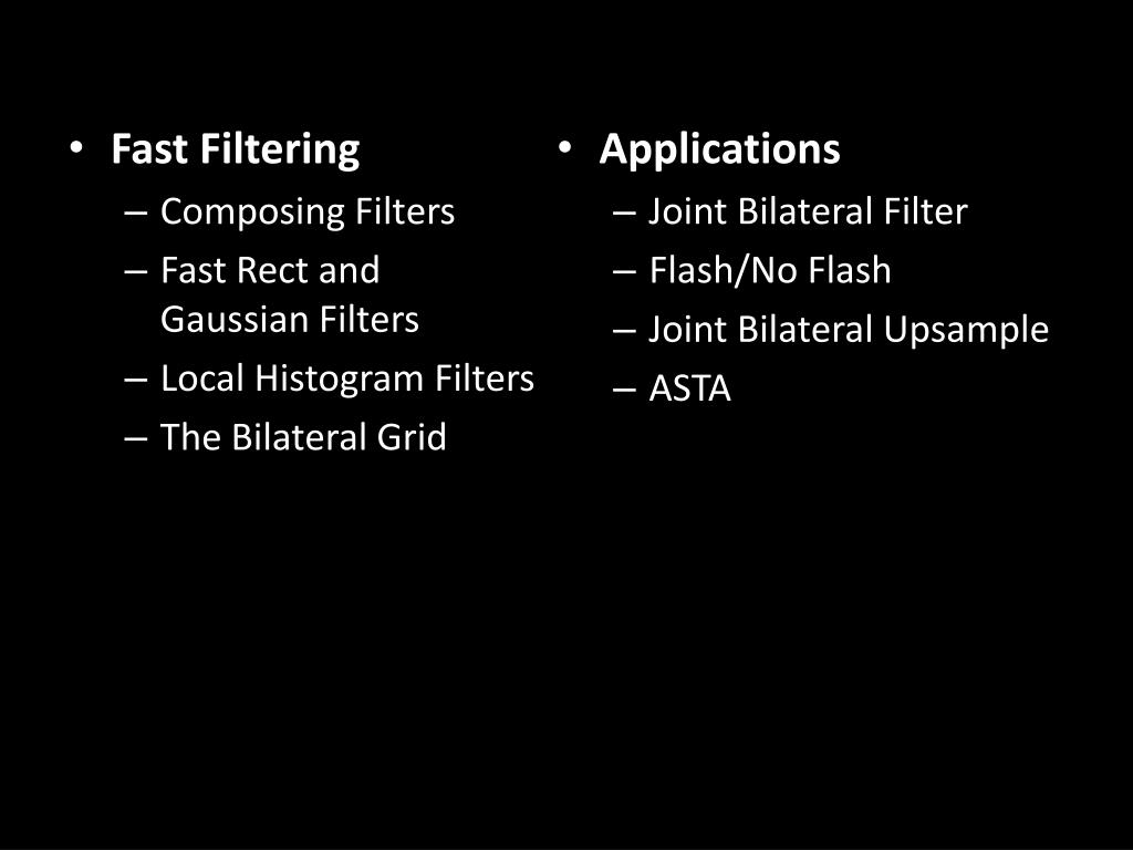 Applications • Joint Bilateral Filter • Flash/No Flash • Joint Bilateral Upsample • ASTA • Fast Filtering • Composing Filters • Fast Rect and Gaussian Filters • Local Histogram Filters • The Bilateral Grid