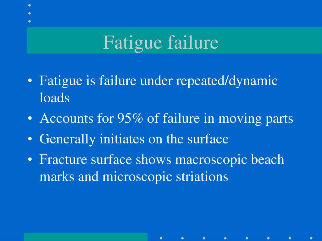 Fatigue failure • Fatigue is failure under repeated/dynamic loads • Accounts for 95% of failure in moving parts • Generally initiates on the surface • Fracture surface shows macroscopic beach marks and microscopic striations