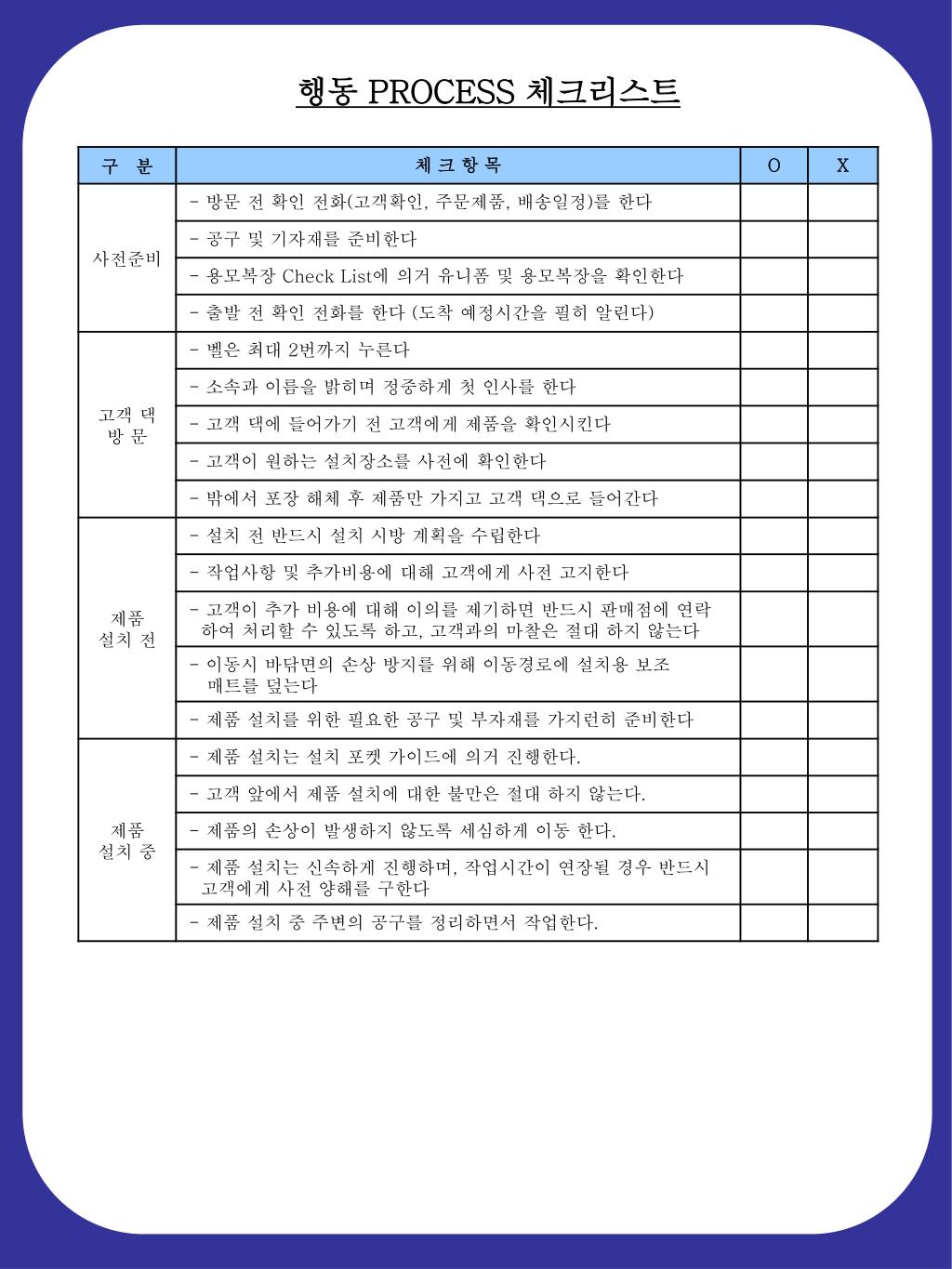 방문 전 확인 전화 주문 제품 확인 깔끔한 용모 복장 출발 전 확인 전화 제품 배송 정중한 첫인사 제품 설치 깔끔한 마무리 바른 복장 서비스 백전백승 고객 유형별 응대 TIP 고객 응대시 하지 말아야 할 TIP 배송설치 서비스 단계별 행동 PROCESS Ⅰ. 사전 준비 - 신속한 서비스와 신뢰감 있는 고객 응대를 위해 사전 준비를 습관화 한다. (용모/복장, 업무 내용 숙지, 제품/공기구/기자재 확인 등) Ⅱ. 배송 설치 - 배송설치 전문가로서 완벽한 배송설치 및 고객의 요구사항을 신속히 파악 하고 충족시키기 위해, 항상 노력하며 신뢰감 있는 모습을 보이도록 한다. Ⅲ. 고객 감동 TIP - 고객을 응대함에 있어 성실하게 응대하며, 고객감동을 실현하기 위한 세심한 배려를 생활화 한다.