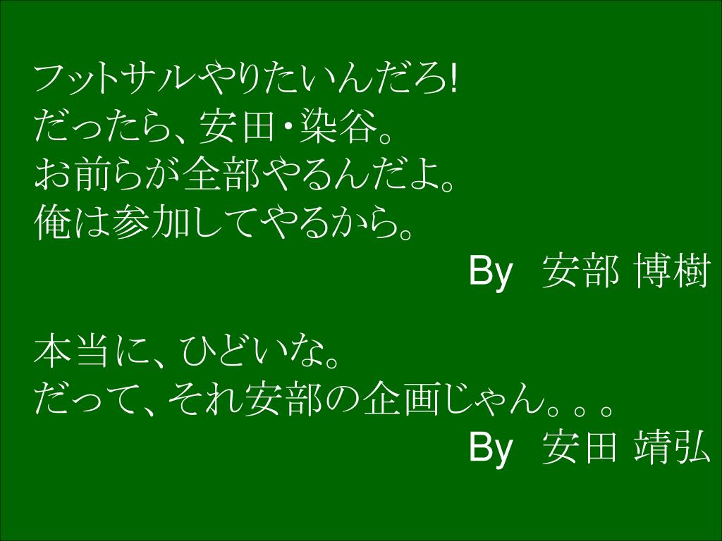 フットサルやりたいんだろ! だったら、安田・染谷。 お前らが全部やるんだよ。 俺は参加してやるから。 By 安部 博樹 本当に、ひどいな。 だって、それ安部の企画じゃん。。。 By 安田 靖弘