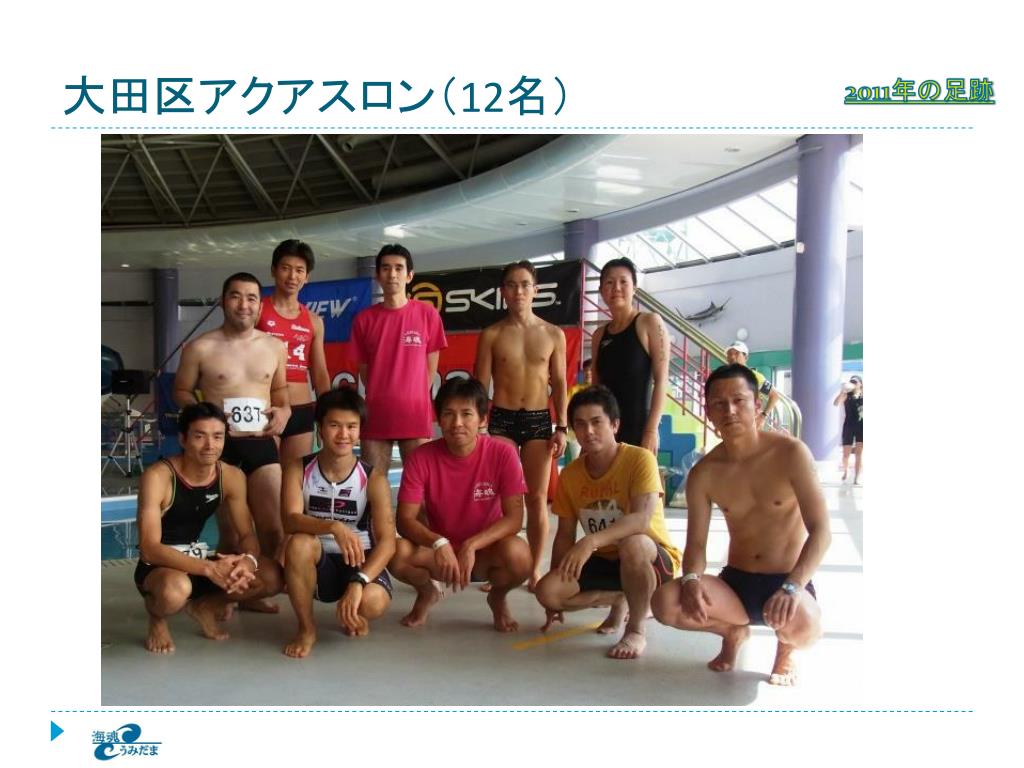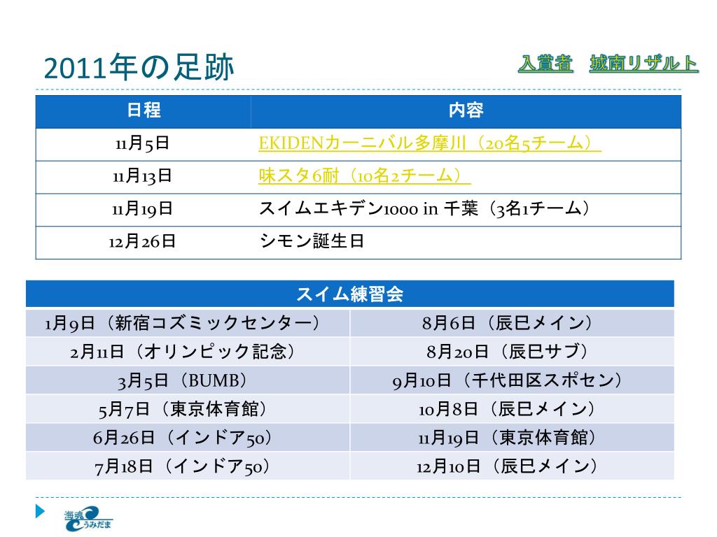 海魂 Kick off Meeting 2012 ~ 成長ホルモンをぶっ放せ!! ~. 2012 年 1 月 7 日 国立オリンピック記念青少年総合センター. アジェンダ. 2011 年の足跡. 2011 年の足跡. 2011 年の足跡. 入賞者. 城南リザルト. 2011 年度 スイム練習会参加回数ランキング. 小林さん12回もの運営ありがとうございました!. 海魂スローガン / キャッチコピーを作ろう! 司会:前島. (例)あなたのやりたいことはなんですか?3 (例)それあるよ、海魂に!2 (例)あなたの夢、あずかってます。2