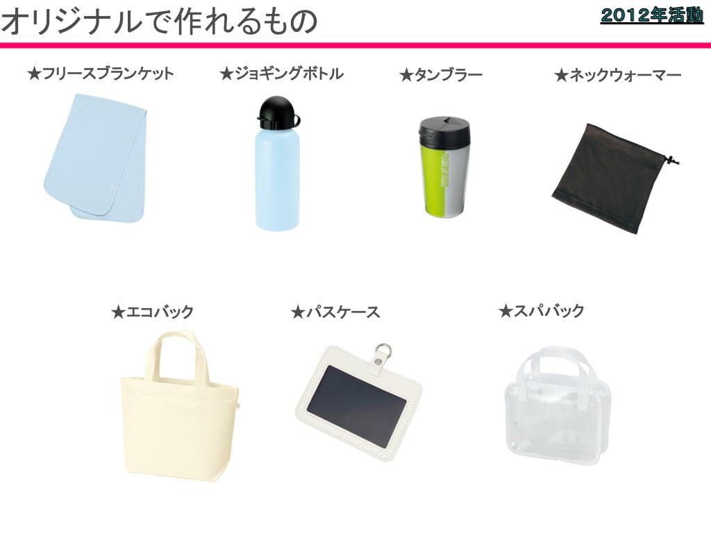 オリジナルで作れるもの 2012年活動 ★フリースブランケット ★ジョギングボトル ★タンブラー ★ネックウォーマー ★スパバック ★エコバック ★パスケース