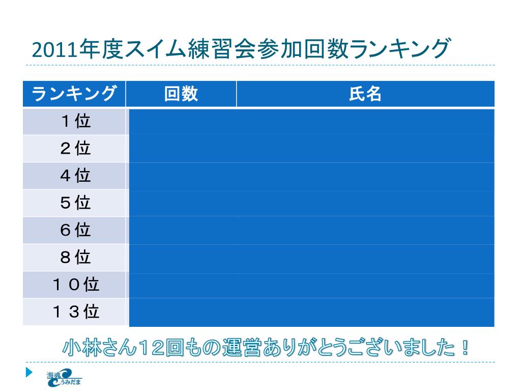 2011年度スイム練習会参加回数ランキング 小林さん12回もの運営ありがとうございました!