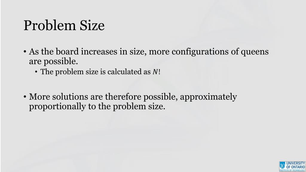 Problem Size • As the board increases in size, more configurations of queens are possible. • The problem size is calculated as • More solutions are therefore possible, approximately proportionally to the problem size.