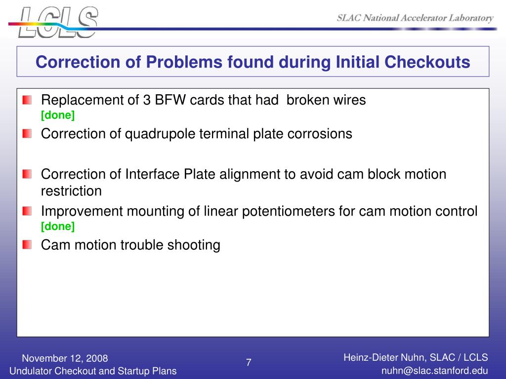 Correction of Problems found during Initial Checkouts • Replacement of 3 BFW cards that had broken wires[done] • Correction of quadrupole terminal plate corrosions • Correction of Interface Plate alignment to avoid cam block motion restriction • Improvement mounting of linear potentiometers for cam motion control [done] • Cam motion trouble shooting 7