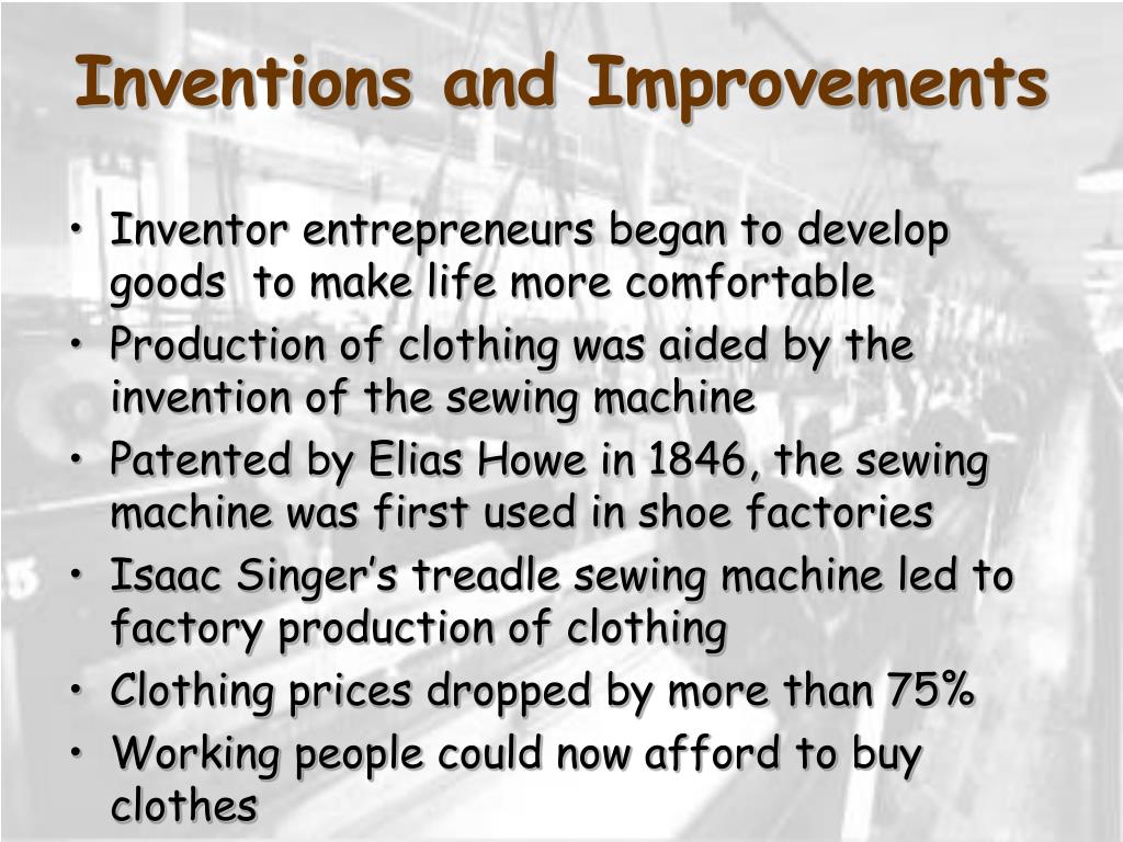 Inventor entrepreneurs began to develop goods to make life more comfortable Production of clothing was aided by the invention of the sewing machine Patented by Elias Howe in 1846, the sewing machine was first used in shoe factories Isaac Singer’s treadle sewing machine led to factory production of clothing Clothing prices dropped by more than 75% Working people could now afford to buy clothes Inventions and Improvements