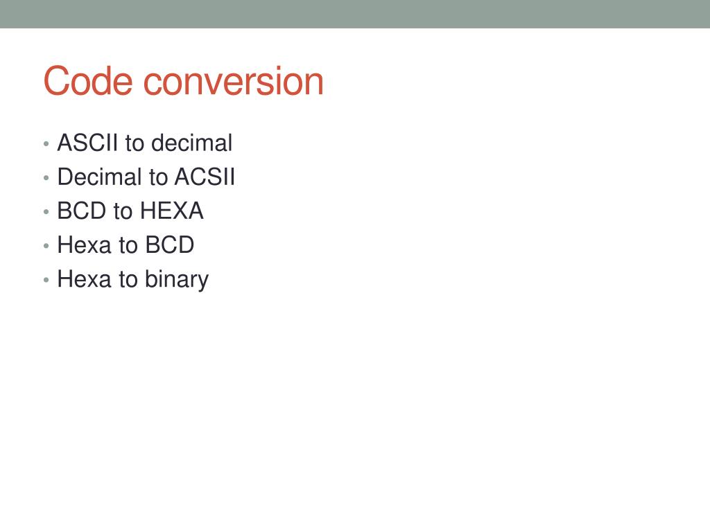 Code conversion • ASCII to decimal • Decimal to ACSII • BCD to HEXA • Hexa to BCD • Hexato binary