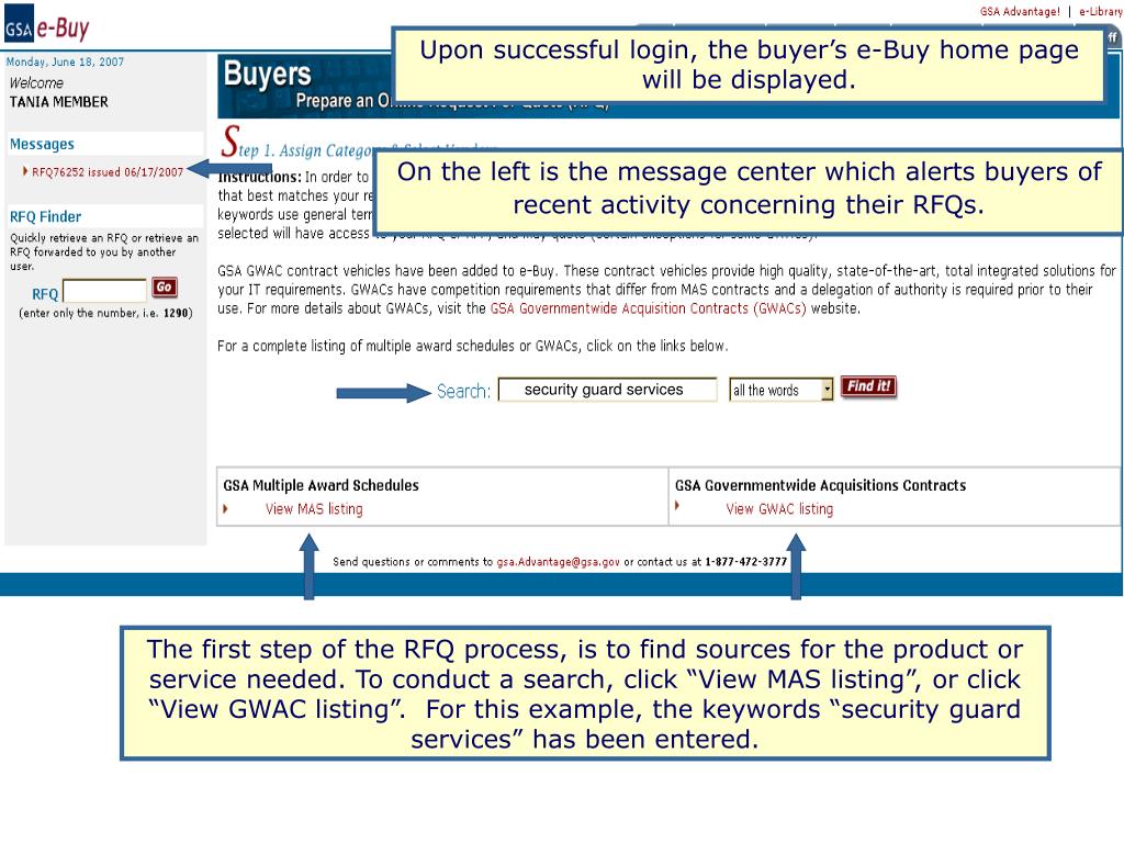 Upon successful login, the buyer’s e-Buy home page will be displayed. On the left is the message center which alerts buyers of recent activity concerning their RFQs. security guard services The first step of the RFQ process, is to find sources for the product or service needed. To conduct a search, click “View MAS listing”, or click “View GWAC listing”. For this example, the keywords “security guard services” has been entered.