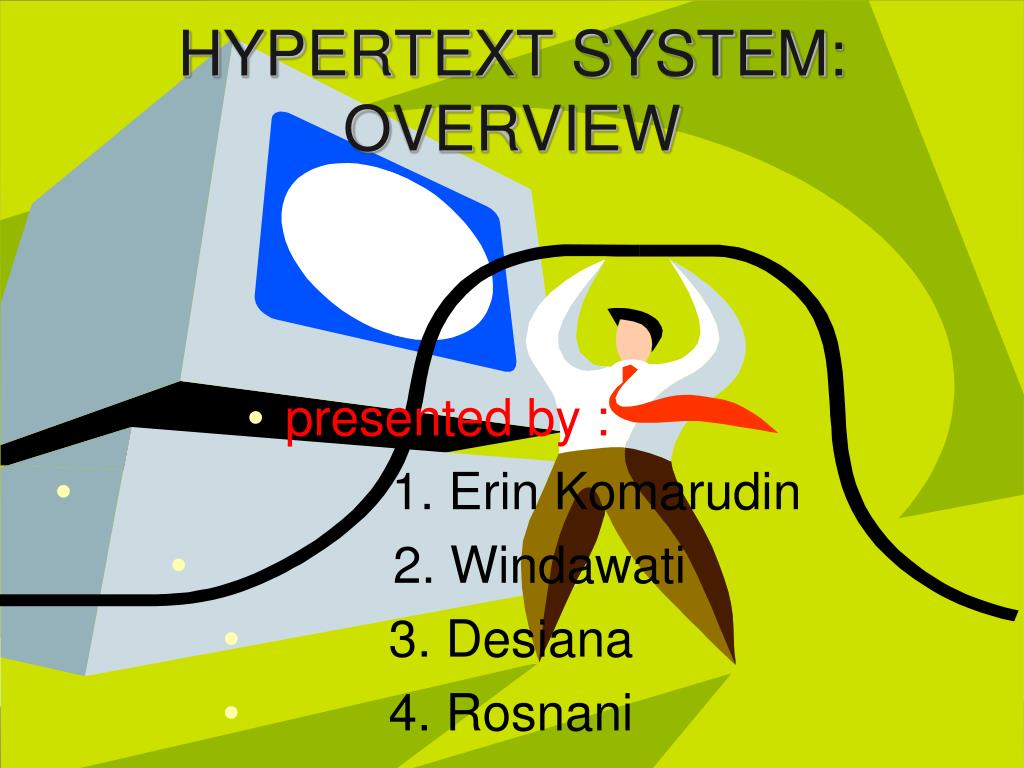 HYPERTEXT SYSTEM: OVERVIEW presented by : 1. Erin Komarudin 2. Windawati 3. Desiana 4. Rosnani