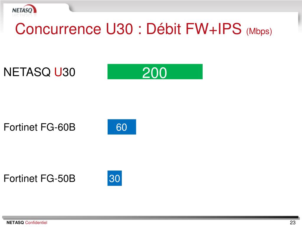 Concurrence U30 : Débit FW+IPS (Mbps) 200 NETASQ U30 Fortinet FG-60B 60 Fortinet FG-50B 30