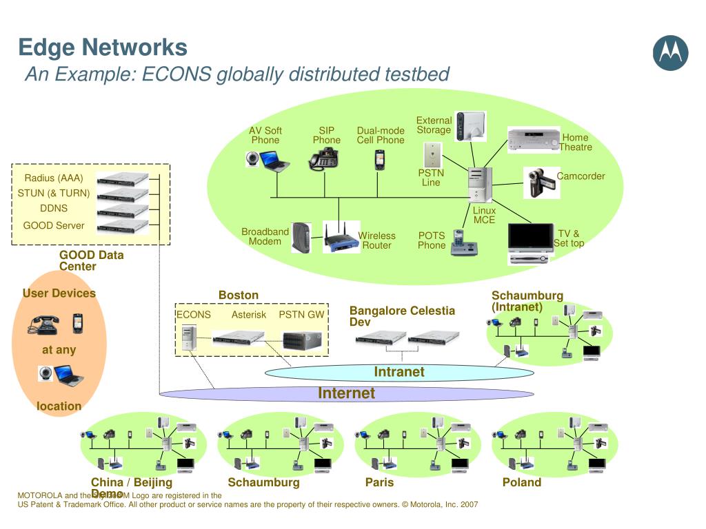 ExternalStorage AV SoftPhone SIPPhone Dual-modeCell Phone HomeTheatre PSTNLine Camcorder Radius (AAA) STUN (& TURN) DDNS Linux MCE GOOD Server BroadbandModem TV &Set top WirelessRouter POTSPhone GOOD Data Center User Devices at any location Boston Schaumburg (Intranet) Bangalore Celestia Dev ECONS Asterisk PSTN GW Intranet Internet China / Beijing Demo Schaumburg Paris Poland Edge NetworksAn Example: ECONS globally distributed testbed