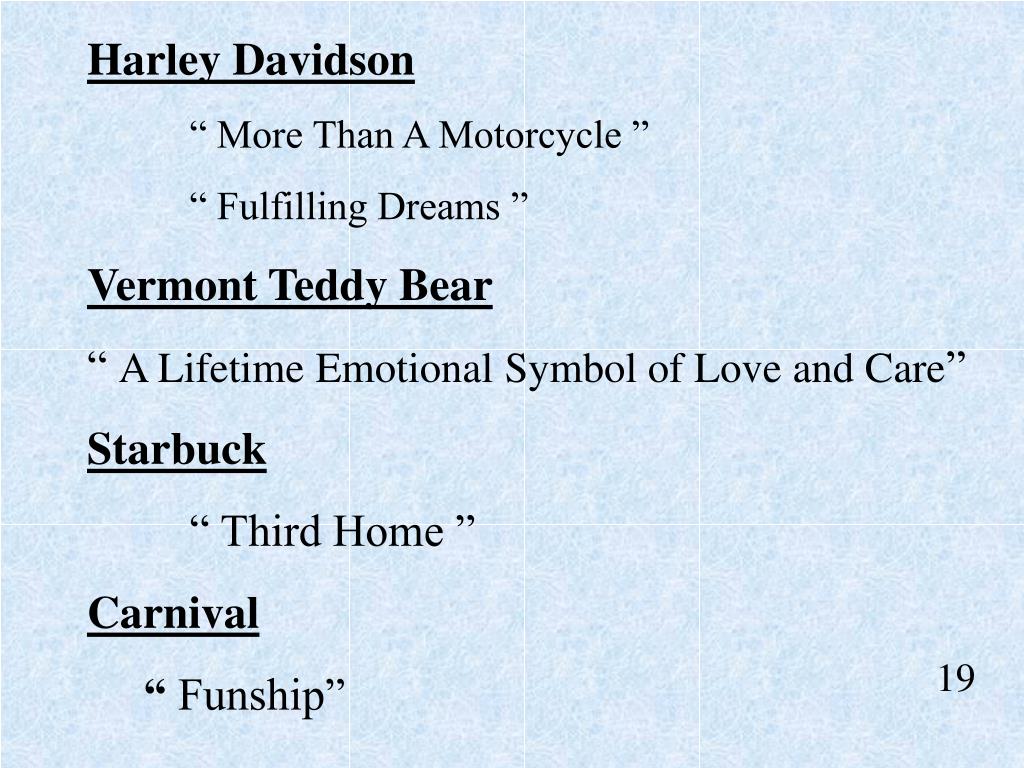 Harley Davidson “ More Than A Motorcycle ” “ Fulfilling Dreams ” Vermont Teddy Bear “ A Lifetime Emotional Symbol of Love and Care” Starbuck “ Third Home ” Carnival “ Funship” 19