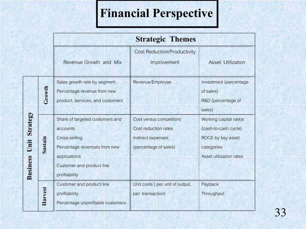 Financial Perspective Strategic Themes Growth Business Unit Strategy Sustain Harvest 33