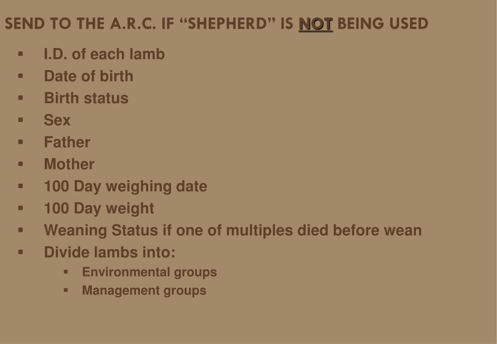 SEND TO THE A.R.C. IF “SHEPHERD” IS NOT BEING USED • I.D. of each lamb • Date of birth • Birth status • Sex • Father • Mother • 100 Day weighing date • 100 Day weight • Weaning Status if one of multiples died before wean • Divide lambs into: • Environmental groups • Management groups