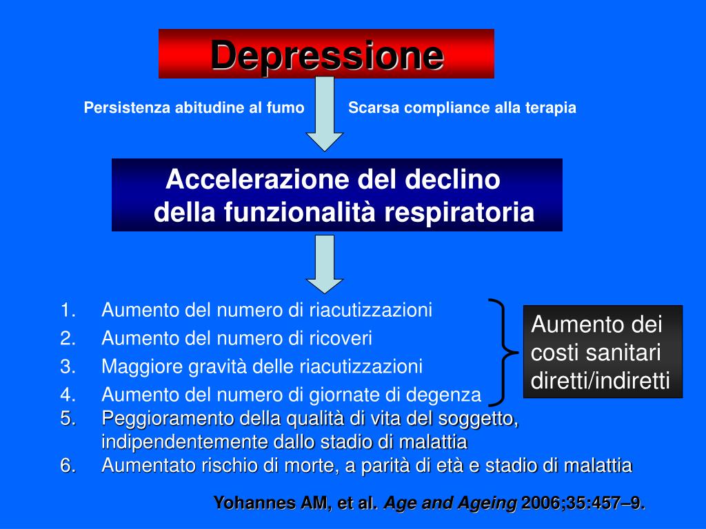 Depressione Persistenza abitudine al fumo Scarsa compliance alla terapia • Aumento del numero di riacutizzazioni • Aumento del numero di ricoveri • Maggiore gravità delle riacutizzazioni • Aumento del numero di giornate di degenza • Peggioramento della qualità di vita del soggetto, indipendentemente dallo stadio di malattia • Aumentato rischio di morte, a parità di età e stadio di malattia Accelerazione del declino della funzionalità respiratoria Aumento dei costi sanitari diretti/indiretti Yohannes AM, et al. Age and Ageing 2006;35:457–9.